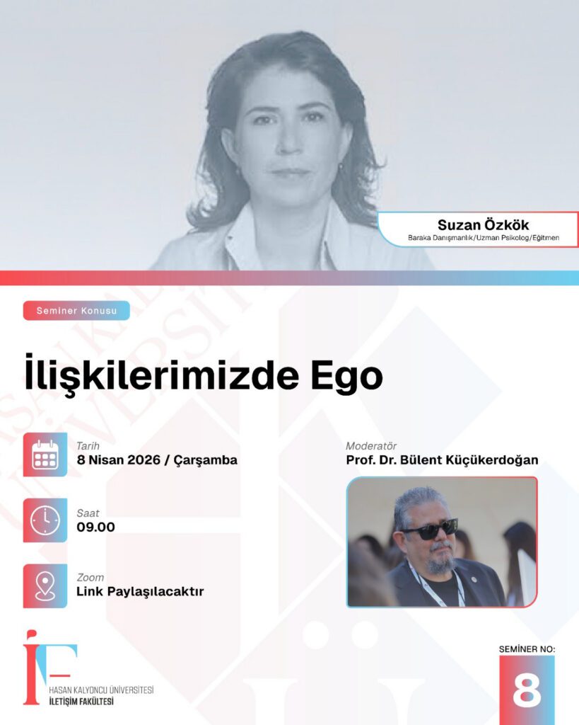 İlişkilerimizde Ego Etkinlik Yazar admin Tarih & Saat: Nisan 8, 2026 09:00 - 11:00 Yer: İletişim Fakültesi Türü Seminer Konu İlişkilerimizde Ego Konusmaci(lar) Suzan Özkök Düzenleyen İletişim Fakültesi Organizasyon Dil Türkçe Açiklama